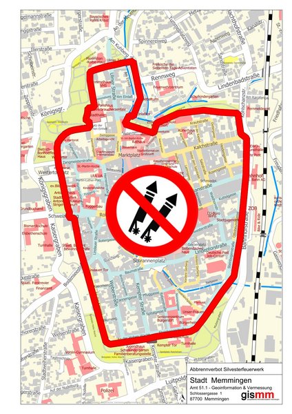 Zum Schutz unserer historischen Gebäude ist das Abschießen von Feuerwerkskörpern in der Memminger Altstadt (siehe Rückseite) an Silvester und Neujahr verboten. Dazu hat die Stadt Memmingen eine Allgemeinverfügung erlassen. Bei Nichteinhaltung drohen Bußgelder.