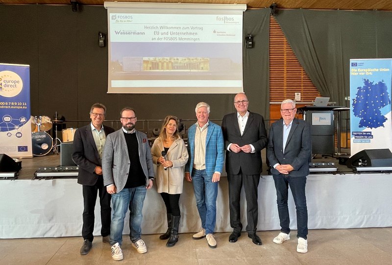 Vor fast 400 Schülerinnen und Schülern berichteten Harald Post, Vorstandsmitglied der Sparkasse Schwaben-Bodensee, sowie Michael Hermann, Geschäftsführer der Wassermann & Co GmbH, in der Aula der FOS/BOS über die „Auswirkungen der EU auf Unternehmen“.