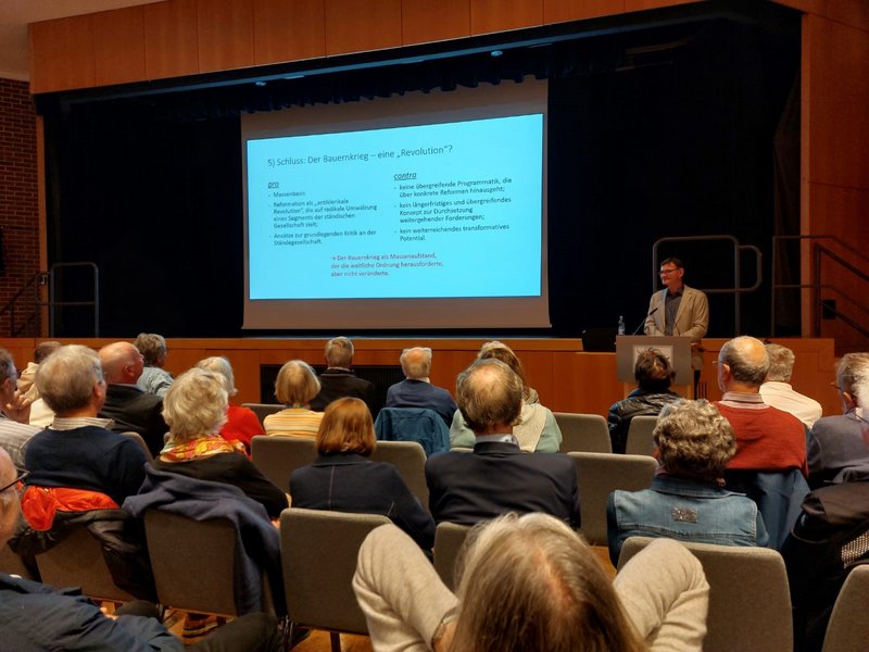 In seinem gut besuchten Vortrag schilderte Prof. Schwerhoff den Verlauf des Bauernkrieges: Die Bauernhaufen hatten das Ziel der Selbstverteidigung, aber auch ein Drohpotential für Verhandlungen aufzubauen. Alle Stände sollten sich zu einer „Christlichen Vereinigung“ zusammenschließen. Darüber hinaus reichende strategische Optionen hatten die Bauern nicht; Aufsehen erregten die Bauernhaufen durch die Eroberung von Burgen und Klöstern vorrangig zum Nahrungserwerb. Demütigungen von Mönchen, Nonnen und z.T. auch Adligen hatten eher symbolischen Charakter, können aber auch als Versuch der Umsetzung der Reformation mit gewaltsamen Mitteln gedeutet werden. Die ländliche Aufstandsbewegung erreichte schnell auch die Städte, deren „Beteiligungsquote“ auf bis zu ein Viertel der Aufständischen geschätzt wird. Aufstände innerhalb der Städte blieben zumeist innerhalb der Stadtmauern, so dass es zu keinen wirklichen Aktionsbündnissen zwischen Stadt und Land kam. Gerade aus der ereignisgeschichtlichen Perspektive wird deutlich, dass die These des „gemeinen Mannes“ als Träger der Bauernkriegsereignisse in Frage zu stellen ist.