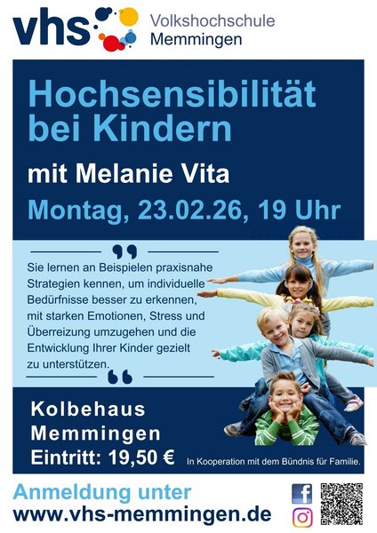 In diesem Vertiefungsseminar zum Thema Hochsensibilität bei Kindern erweitern Sie Ihre Kompetenzen im Umgang mit hochsensiblen Kindern. Aufbauend auf den Grundlagen zum Thema lernen Sie individuelle Unterstützungsangebote kennen. Gemeinsam erarbeiten wir praxisnahe Strategien, um die besonderen Bedürfnisse hochsensibler Kinder im Alltag zu berücksichtigen. Sie erfahren, wie Sie mit starken Emotionen, Stressreaktionen und Überreizung umgehen können. Zudem reflektieren wir, wie elterliche Unterstützung angepasst werden kann, um die emotionale und soziale Entwicklung hochsensibler Kinder optimal zu begleiten.