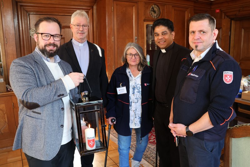 Das Licht von Bethlehem ist im Memminger Rathaus angekommen. Im Rahmen der diesjährigen Friedenslicht-Aktion überreichte Roberto Kalz, Dienststellenleiter der Malteser Memmingen, eine Laterne mit dem Kerzenlicht an Oberbürgermeister Jan Rothenbacher. „Gerade in diesen unfriedlichen Zeiten ist es wichtig, den Fokus auf Frieden und Hoffnung zu richten“, betonte Oberbürgermeister Jan Rothenbacher. Begleitet wurde die Übergabe von Stadtpfarrer Pater Joshy Palakunnel, Diakon i.R. Roland Pressl und der ehrenamtlichen Mitarbeiterin der Malteser Monika Baum.