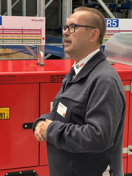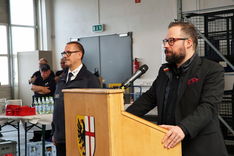 Andreas Land, Leiter des Amts für Brand und Katastrophenschutz gab zudem einen Überblick zur neuen Lagerhaltung und wie im Bedarfsfall oder einem Großschadensereignis die Materialien an die Hilfsorganisationen kommen. Das neue Lager, mit einer Fläche von 980 Quadratmetern, bietet Platz für 11 Regalreihen mit 600 Palettenstellplätzen in einem Schwerlastregal, samt digitalem Lagerprogramm. Dafür wurden auch die passenden Transportkomponenten beschafft: Teleskoplader und „Ameise“ (Elektro-Hubwagen). Das Gebäude wurde mit Schließanlage sowie Einbruch- und Brandmeldeanlage aufgerüstet, zusätzlich wurde effizientere Beleuchtung installiert. Bis Ende des Jahres sind außerdem die Notstromeinspeisung und eine redundante Internetverbindung einsatzbereit. Andreas Land bedankte sich bei allen Verantwortlichen und betonte: „Alle Erweiterungen und Änderungen am Gebäude, konnten durch unser eigenes Personal vorgenommen werden.“