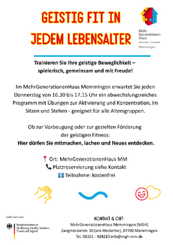 Jeden Donnerstag erwartet Sie im MehrGenerationenHaus ein abwechslungsreiches Programm mit Übungen zur Aktivierung und Konzentration, im Sitzen und Stehen - abgestimmt auf Seniorinnen und Senioren Ob zur Vorbeugung oder zur gezielten Förderung der geistigen Fitness: Hier dürfen Sie mitmachen, lachen, Neues entdecken. Kommen Sie gerne spontan vorbei!