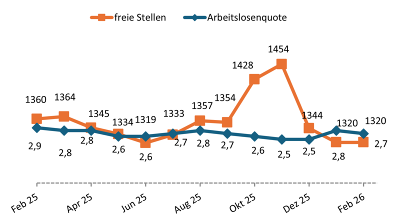 Der Bestand an Arbeitsstellen iliegt im Februar unverändert bei 1.320; im Vergleich zum Vorjahresmonat gab es 40 Arbeitsstellen weniger.