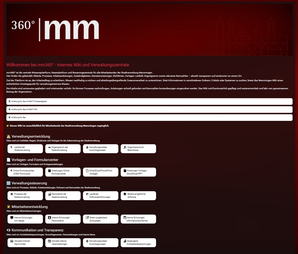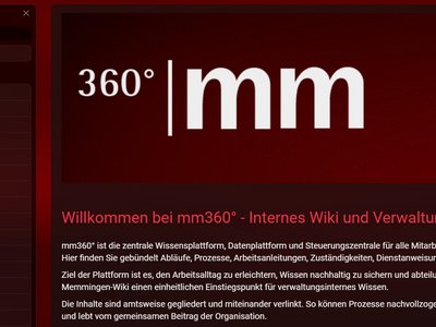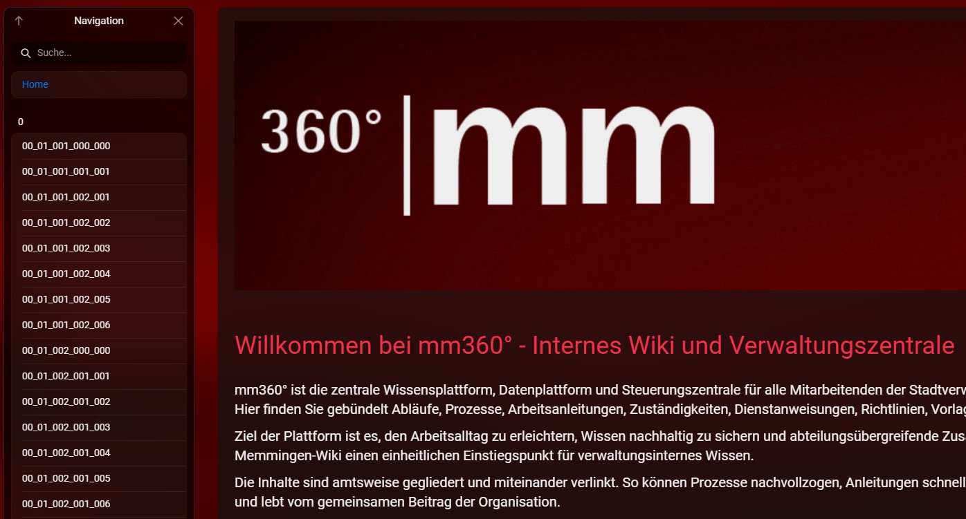 Das Herzstück von mm360° ist ein verwaltungsweites Wiki als verbindliche Wissensquelle für alle Mitarbeitenden. Über 5.100 Verwaltungsprozesse werden darin strukturiert dokumentiert, miteinander verknüpft und kontinuierlich weiterentwickelt.