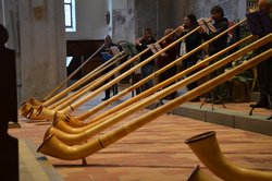 Jedes Jahr veranstaltet die Landesakademie Ochsenhausen einen Kurs für Alphörner unter der Leitung des Baseler Alphornspezialisten Martin Roos. Das Abschlusskonzert der Kursteilnehmer ist traditionell in St. Martin. So auch in diesem Jahr. Etwa 15 Alphornbläser spielen in verschiedenen Formationen und auf den ganzen Kirchraum verteilt ihre im Kurs erarbeiteten Werke. Dabei erklingen Kompositionen für ein oder mehrere Alphörner plus Orgel.