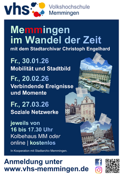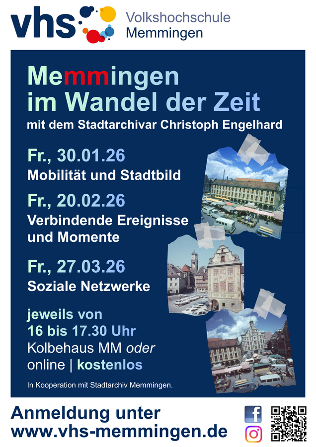 Die Volkshochschule Memmingen und das Stadtarchiv laden Sie herzlich ein, gemeinsam in die bewegte Geschichte unserer Stadt einzutauchen. In der neuen Gesprächsreihe „Memmingen im Wandel der Zeit“ werfen wir einen Blick auf die vergangenen Jahrzehnte und fragen: Welche Ereignisse haben unsere Stadt und ihre Menschen geprägt? Welche Erinnerungen sind bis heute lebendig geblieben, und welche Aspekte unserer Geschichte dürfen wir nicht vergessen?