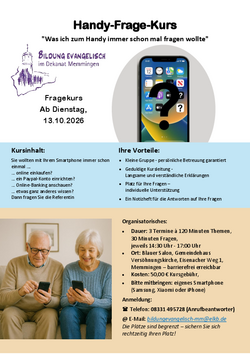 In diesem Kurs können Sie alle Fragen stellen, die Sie zum Handy schon immer einmal fragen wollten. Der Kurs richtet sich an fortgeschrittene Nutzer, es ist KEIN Anfängerkurs, Grundkenntnisse werden in diesem Kurs nicht vermittelt Sie können z. B. fragen, - wie online einkaufen geht - wie man ein Paypal-Konto anlegt - wie Online Banking funktioniert ....