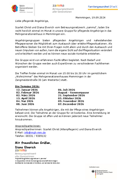 Angehörigengruppen bieten pflegenden Angehörigen und nahestehenden Pflegepersonen die Möglichkeit zum Austausch über erlebte Pflegesituationen. Als Betroffene bleiben Sie mit Ihren Fragen nicht allein und durch den Austausch und neuen Impulsen von außen, kann die eigene Sicht auf die Pflegesituation verändert und erleichtert werden und es können neue soziale Kontakte entstehen.